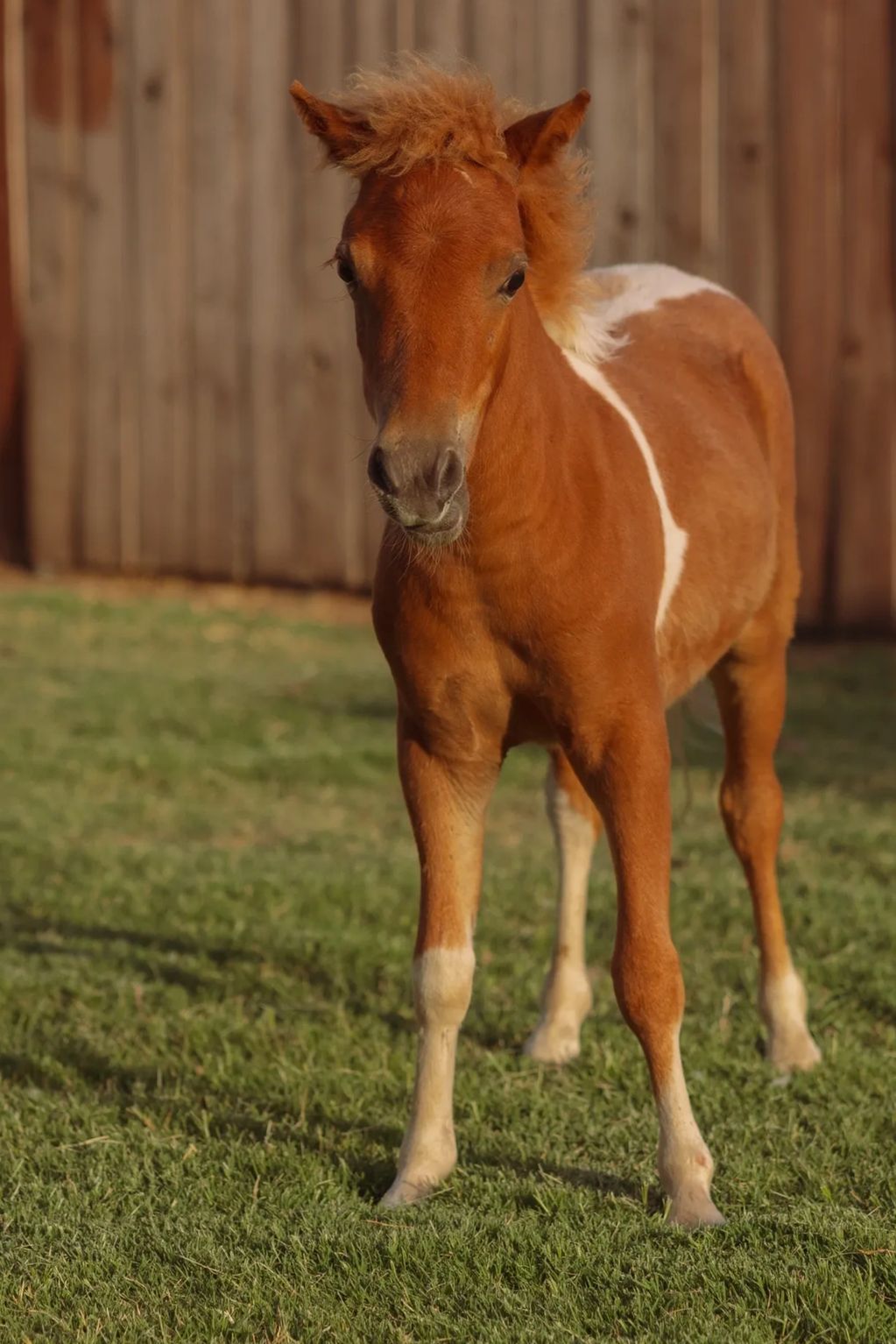 Born April 2025. This adorable Miniature horse filly is available to the perfect home. She will be ready for her new home in November of 2025.